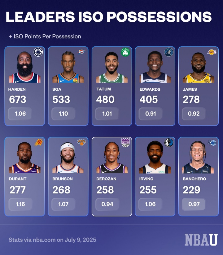 07月09日讯 今日,美媒NBA University在社交媒体上晒出了上赛季NBA单挑相关数据:“24-25赛季单挑回合数和每回合得分,谁更出色?”